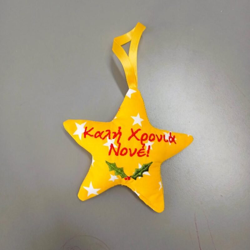 Ραμμένο στο χέρι με χαρούμενο κίτρινο ύφασμα με λευκά αστεράκια, και κεντημένο με κόκκινη κλωστή, μεταφέρει την πιο ζεστή ευχή στον αγαπημένο σου νονό. 🎅💛