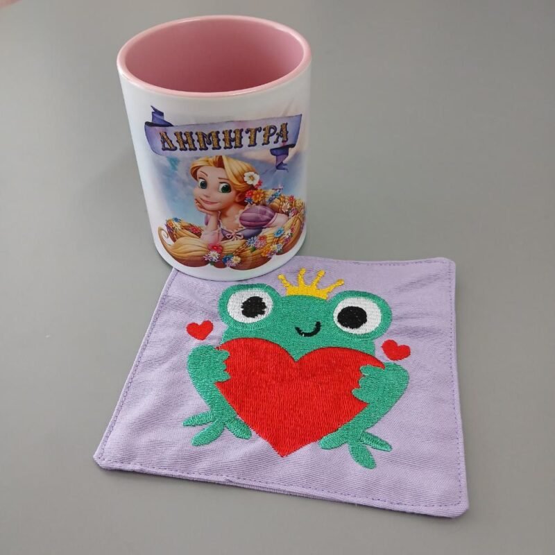 2. Σουβέρ χειροποίητο μωβ ύφασμα λονέτα με κεντημένo τον πρίγκιππα βάτραχο!