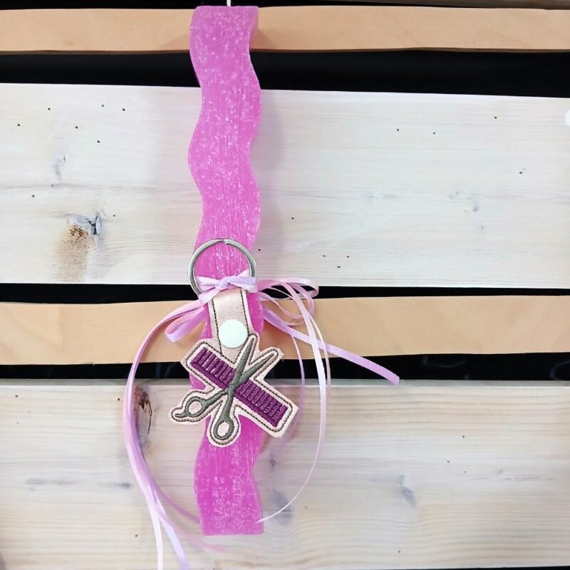 Δημιούργησα αυτή τη χειροποίητη αρωματική λαμπάδα με αγάπη και προσοχή στη λεπτομέρεια. Τη διακόσμησα με ένα ιδιαίτερο μπρελόκ από δερματίνη, κεντημένο σε σχέδιο εμπνευσμένο από την κομμωτική τέχνη.