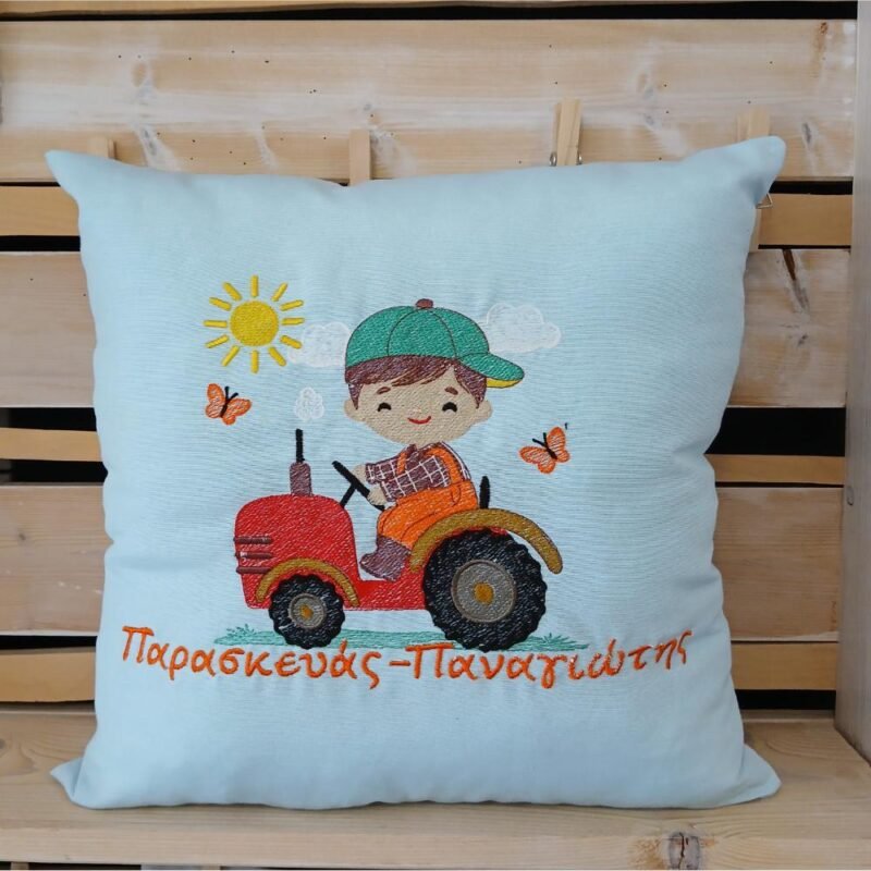 Χειροποίητο και προσωποποιημένο μαξιλάρι με κέντημα έναν γλυκό αγρότη πάνω στο τρακτέρ του και φυσικά το όνομα του!
