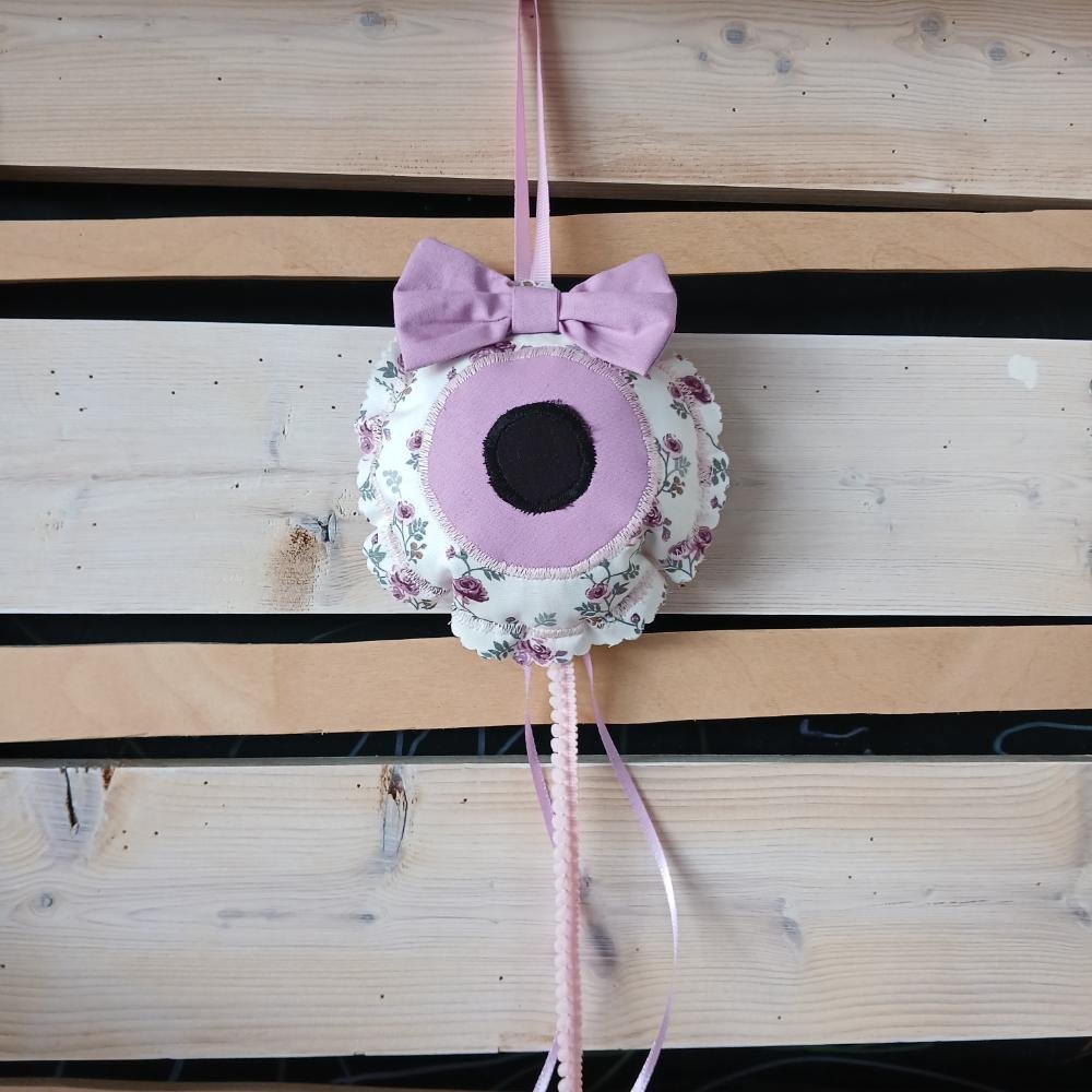Δημιουργούμε το ματάκι από φλοράλ βαμβακερό υφάσματα σε λιλά αποχρώσεις και προσθέτουμε φιόγκο και κορδέλες για μια τρυφερή, διακοσμητική πινελιά. Κρεμάστε το στην κούνια, στο καρότσι ή στο παιδικό δωμάτιο.