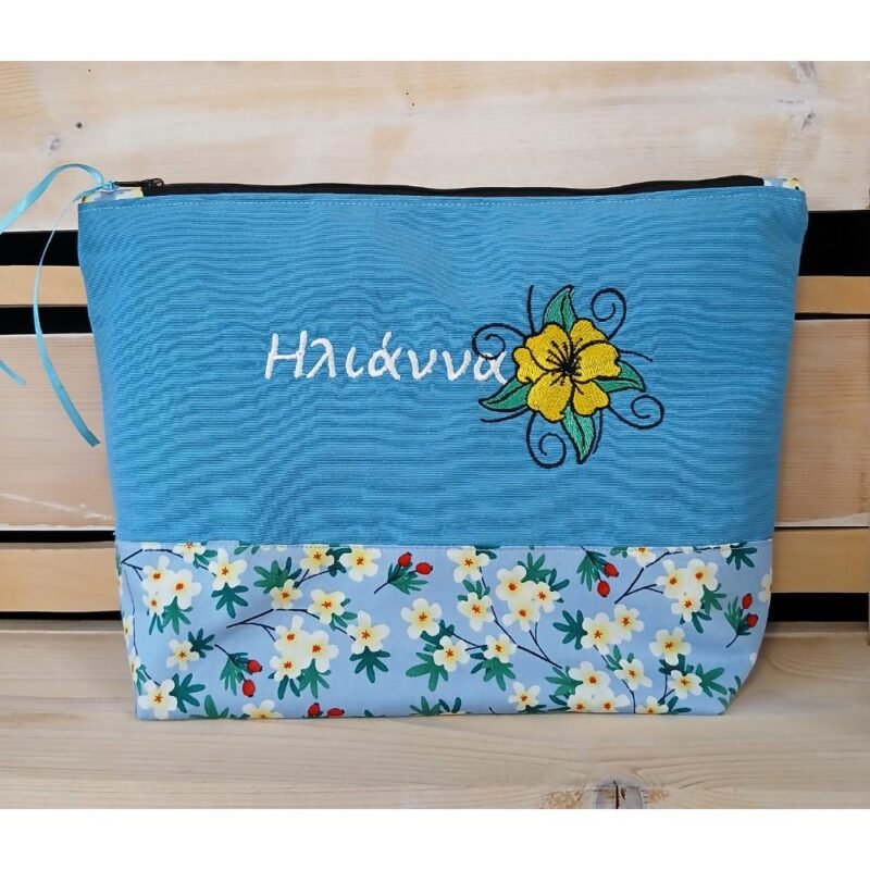 Χειροποίητο και προσωποποιημένο νεσεσέρ με ύφασμα λονέτα μπλε στο επάνω και πίσω μέρος στην οποία κεντήσαμε ένα κίτρινο λουλούδι και φυσικά όνομα! Ποπλίνα μπλε φλοράλ στο κάτω και εσωτερικό μέρος του νεσεσέρ.