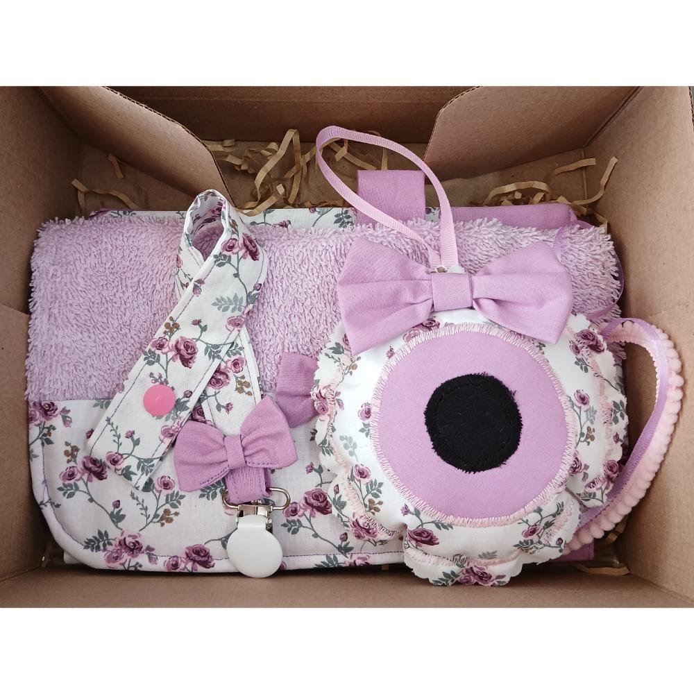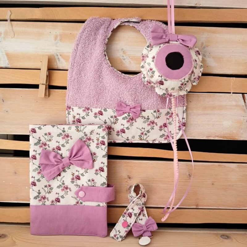 Ένα τρυφερό χειροποίητο σετ για νεογέννητο. Αποτελεί όμορφη επιλογή για δώρο γέννησης ή βάπτισης. Τα απαλά υφάσματα και οι ρομαντικές φλοράλ λεπτομέρειες χαρίζουν ιδιαίτερη αισθητική. Παράλληλα προσφέρουν πρακτικές λύσεις για την καθημερινότητα του μωρού.