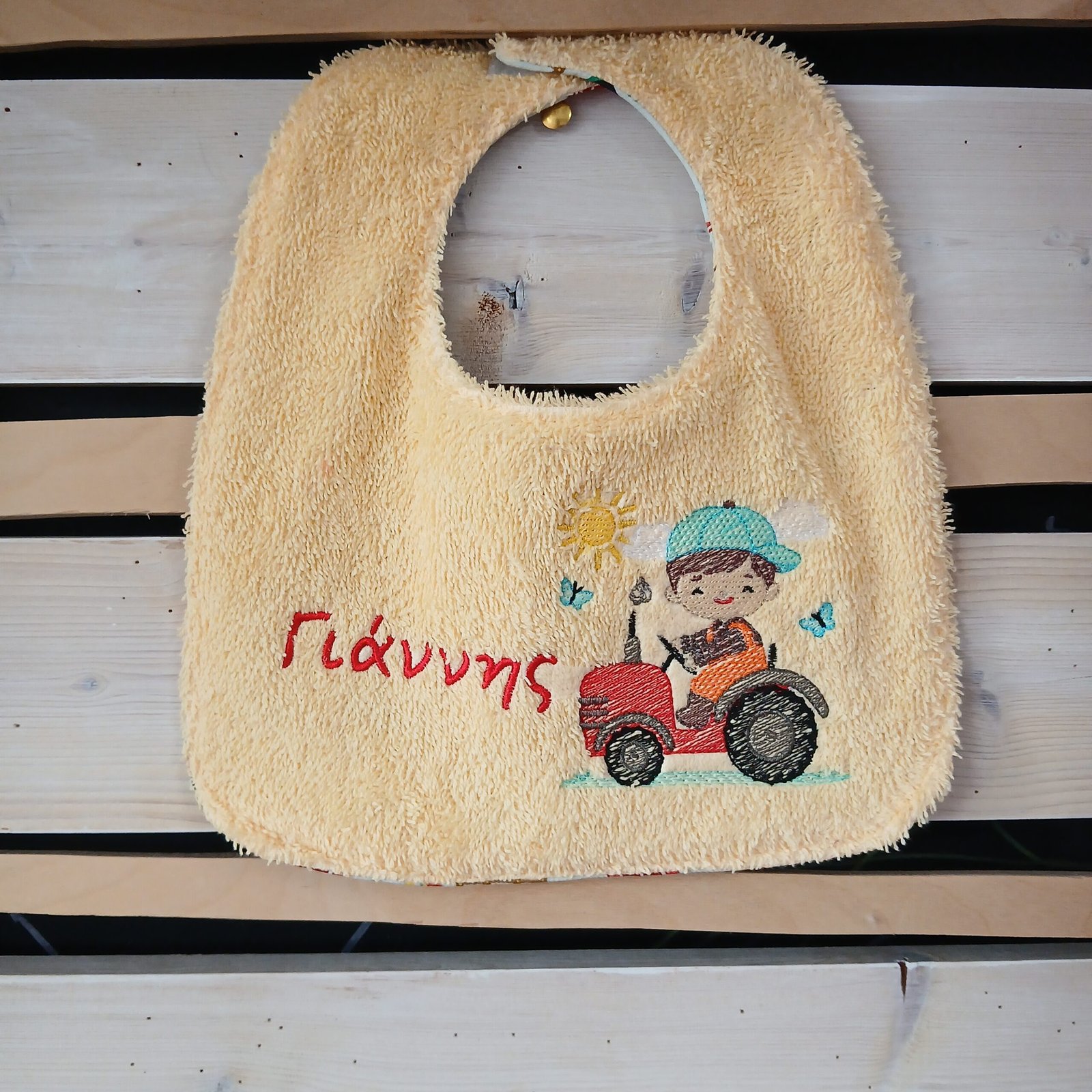 Η βαμβακερή απορροφητική σαλιάρα είναι κεντημένη με το όνομα του παιδιού και ένα γλυκό σχέδιο παιδιού πάνω σε τρακτέρ, ενώ το μαξιλαράκι σε σχήμα τρακτέρ συμπληρώνει τέλεια το σύνολο.