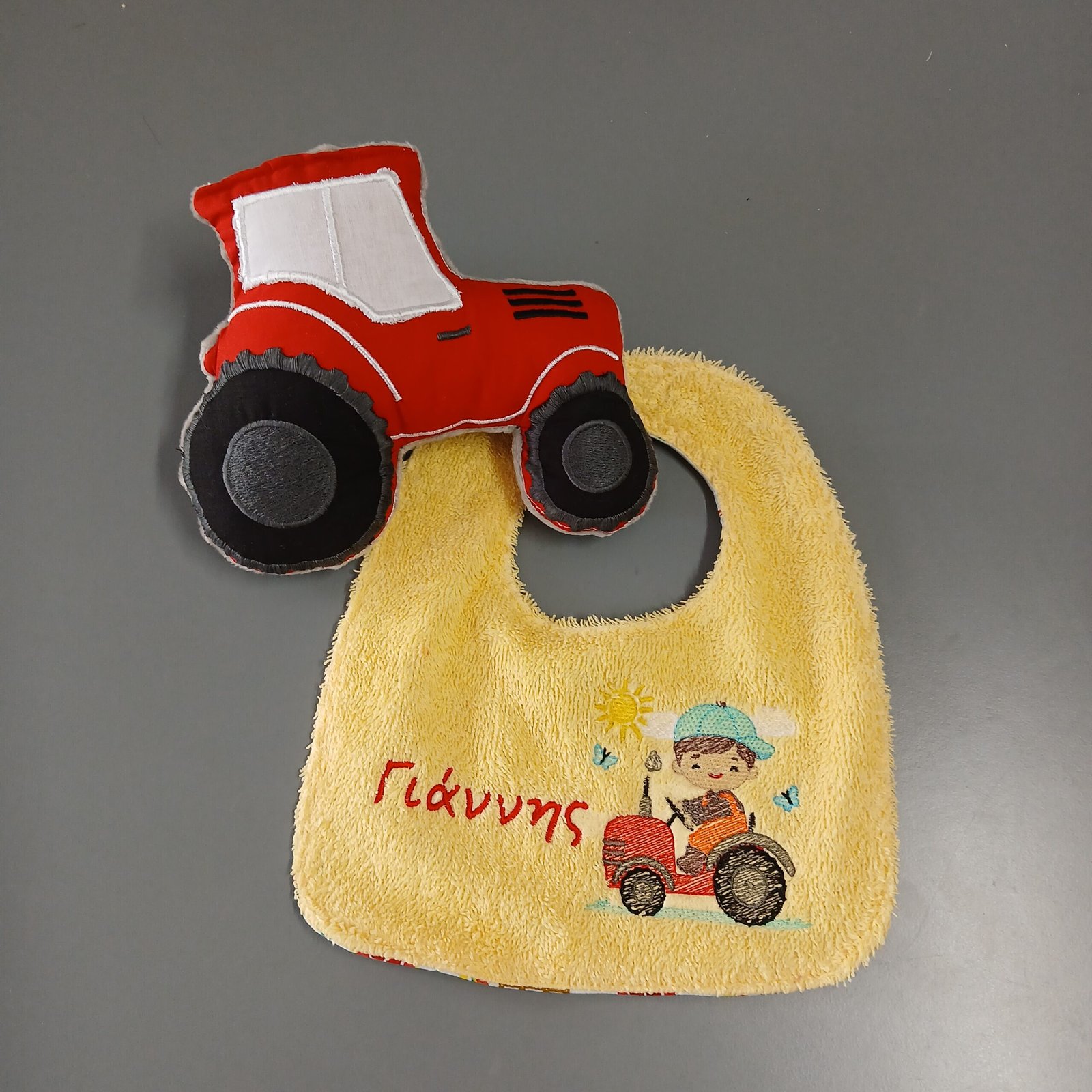 ειροποίητο σετ δώρου για αγοράκι με σαλιάρα και μαξιλαράκι τρακτέρ, κεντημένο με το όνομα του παιδιού. Ιδανικό για βάπτιση, γέννηση ή baby shower.
