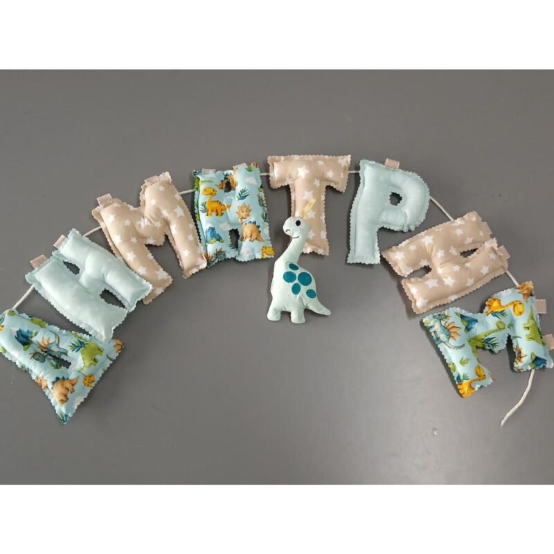 Υφασμάτινη γιρλάντα ονόματος με μοτίβο δεινόσαυρους και αστέρια σε παλ αποχρώσεις εκρού και βεραμάν.